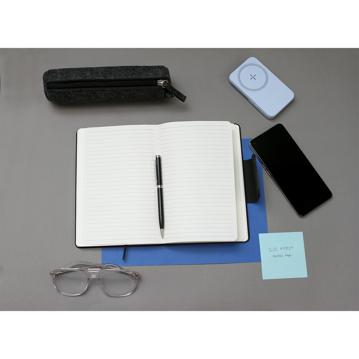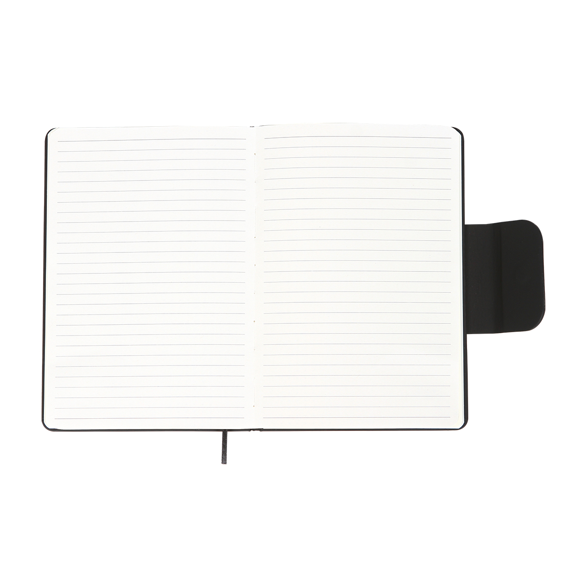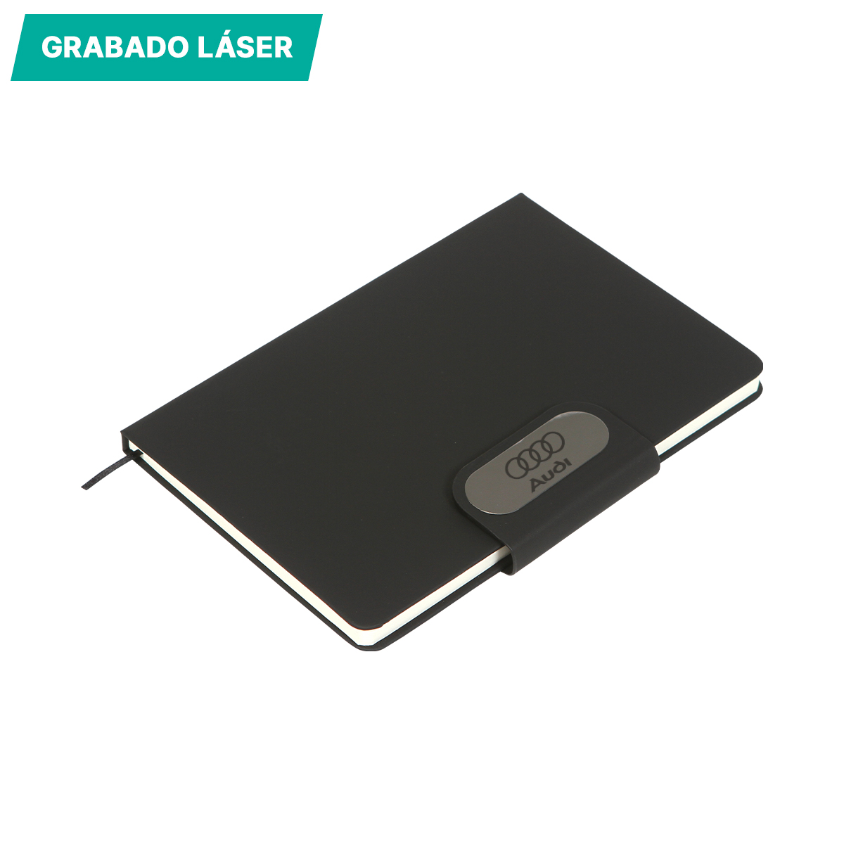 Cuenta con un práctico cierre de solapa con imán, que protege tus notas, y una placa metálica decorativa que añade un detalle distintivo y moderno. Perfecta para reuniones, apuntes personales o como regalo corporativo.