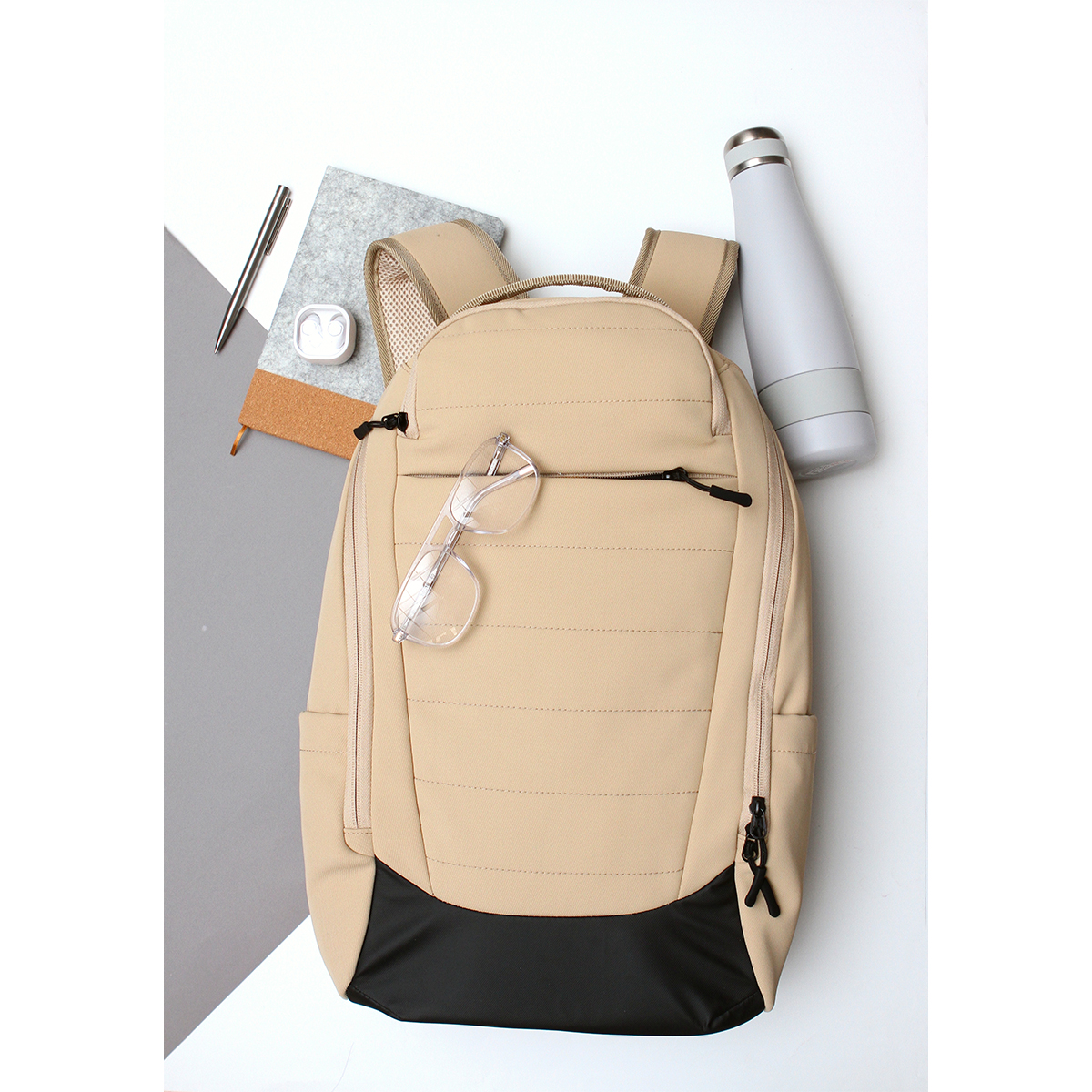 Mochila confeccionada en tejido sarga compuesto con respaldo de punto y tejido taslon rip stop, forro 210D 100% poliéster. Parte inferior: 600D con revestimiento de TPE, un bolsillo principal con cremallera, compartimento para computadora portátil, dos bolsillos frontales con cremallera y dos bolsillos laterales extensibles. Correa para espalda y hombro acolchada con espuma y malla para reducir el estrés. Correas: correas de PP 600D. Volumen: 21,5 litros.