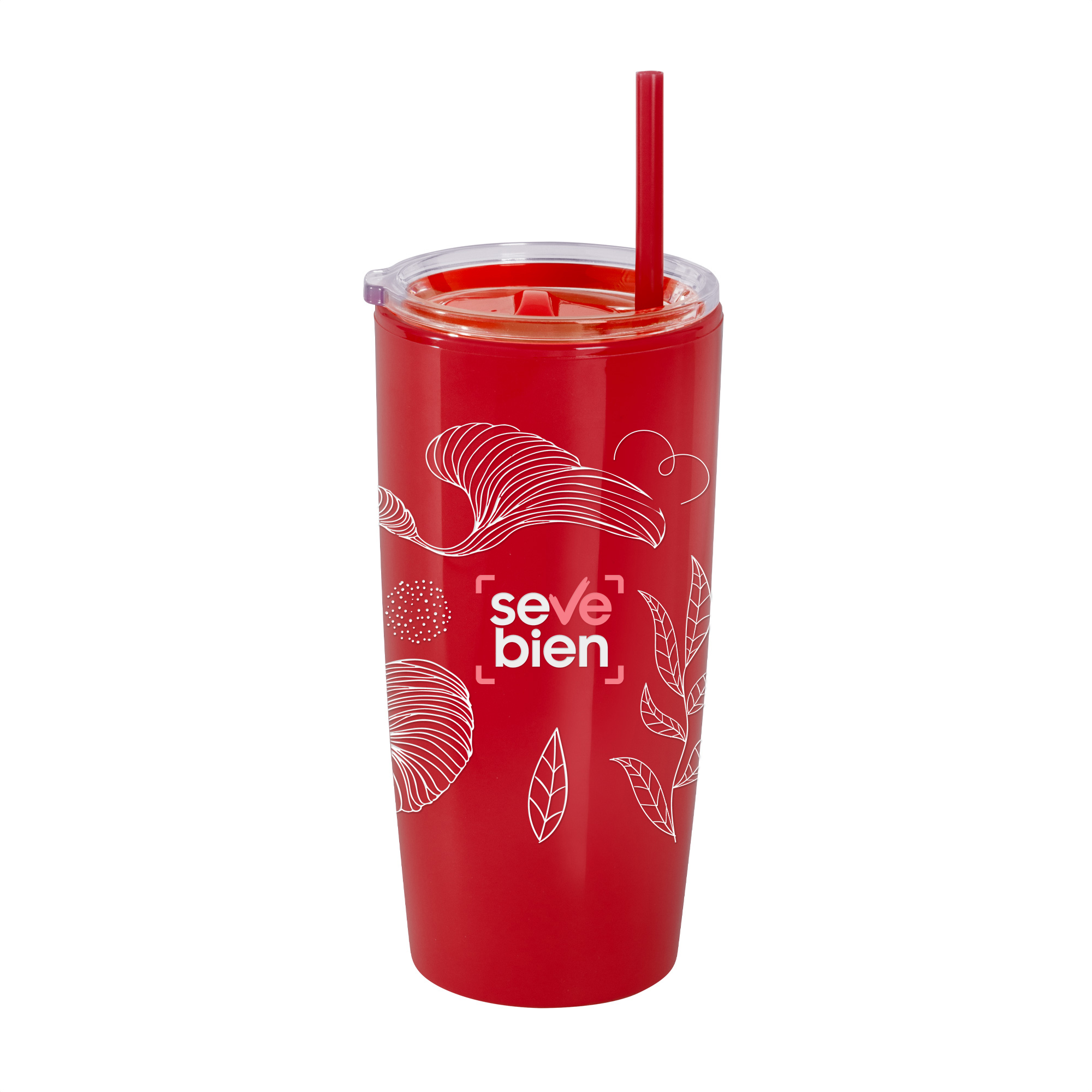Disfruta de tus bebidas favoritas con comodidad.Mug doble pared con popote. Tapa plástica transparente a presión con anillo de silicona. Popote de polipropileno y cierre deslizante del mismo color que el cuerpo. Cuerpo con acabado brillante. Medidas: Ø 9 cm x 18,6 cm.