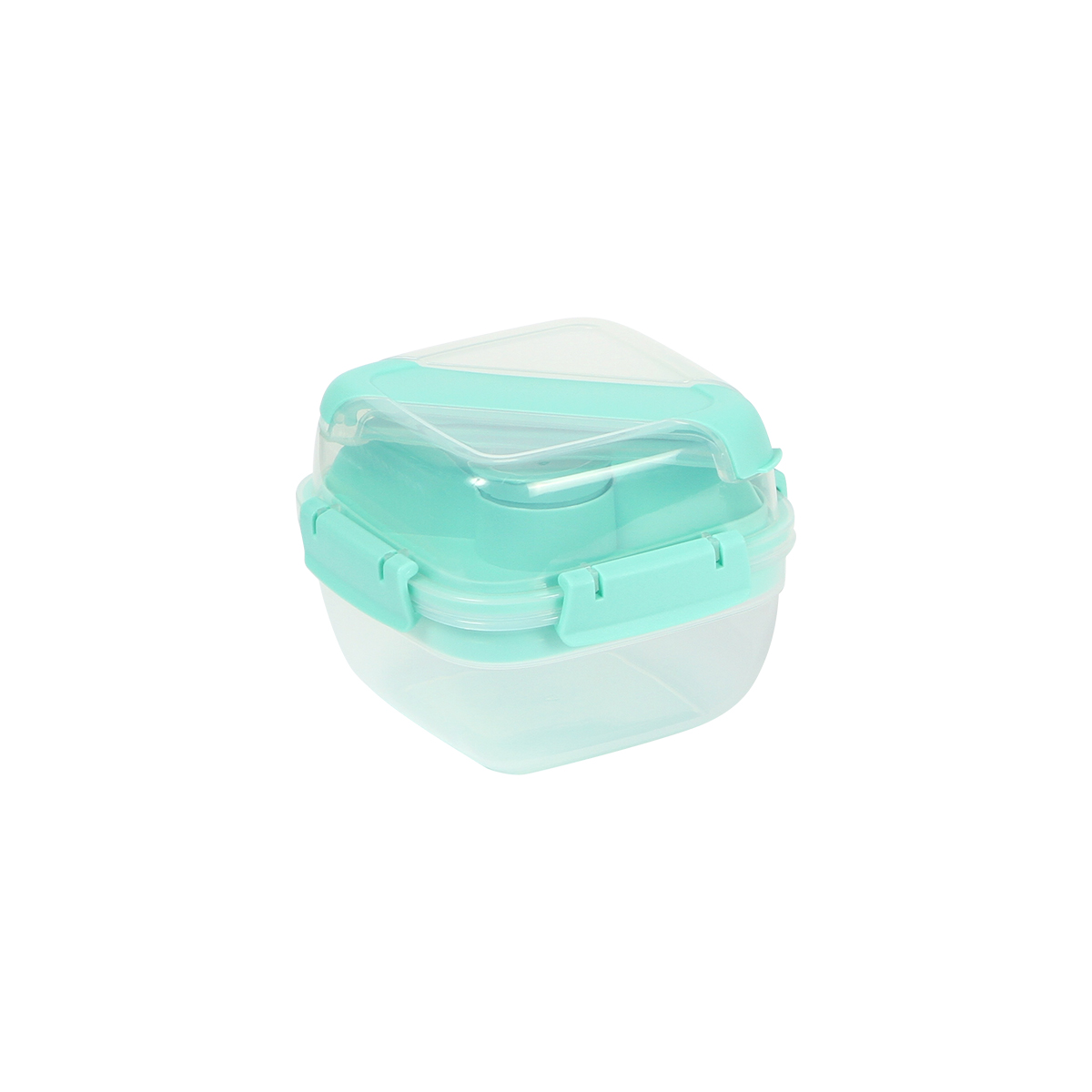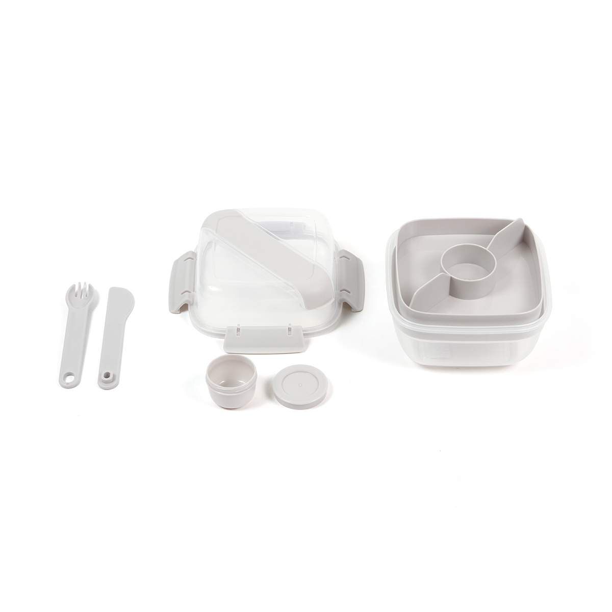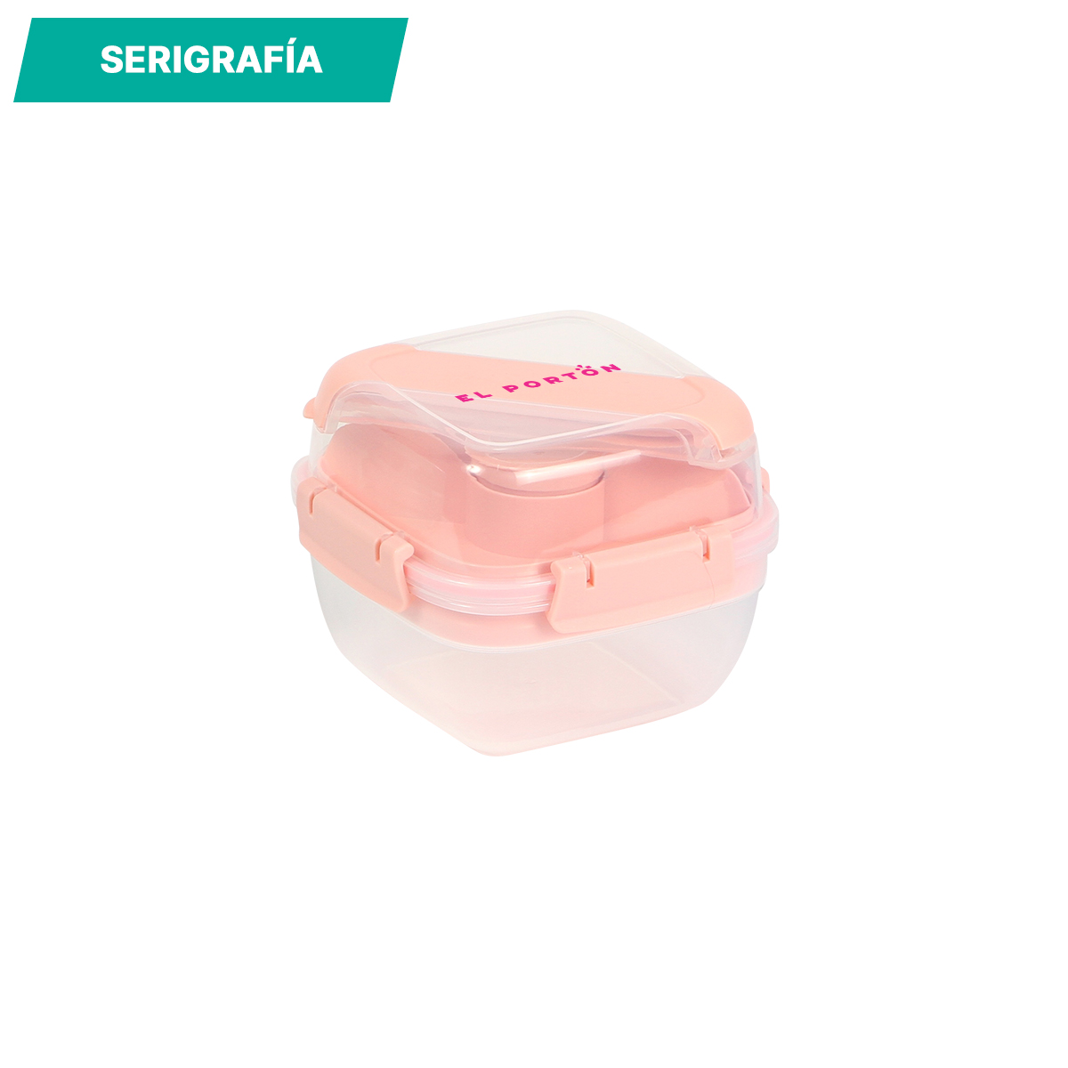 Contenedor de alimentos hermético fabricado en polipropileno y silicón. Es resistente e ideal para mantener tus comidas frescas y seguras. Con diseño compacto y práctico, es perfecto para llevar al trabajo o escuela. Incluye una cuchara, un tenedor, un cuchillo, un contenedor de alimentos con tapa con divisores y un contenedor pequeño tipo salsero.