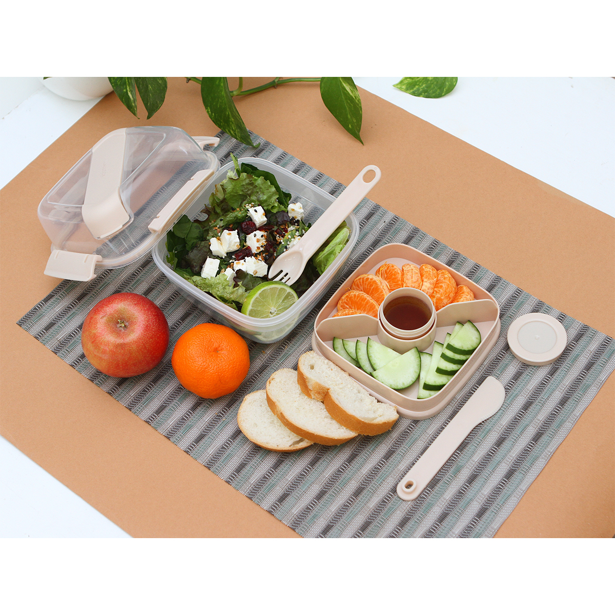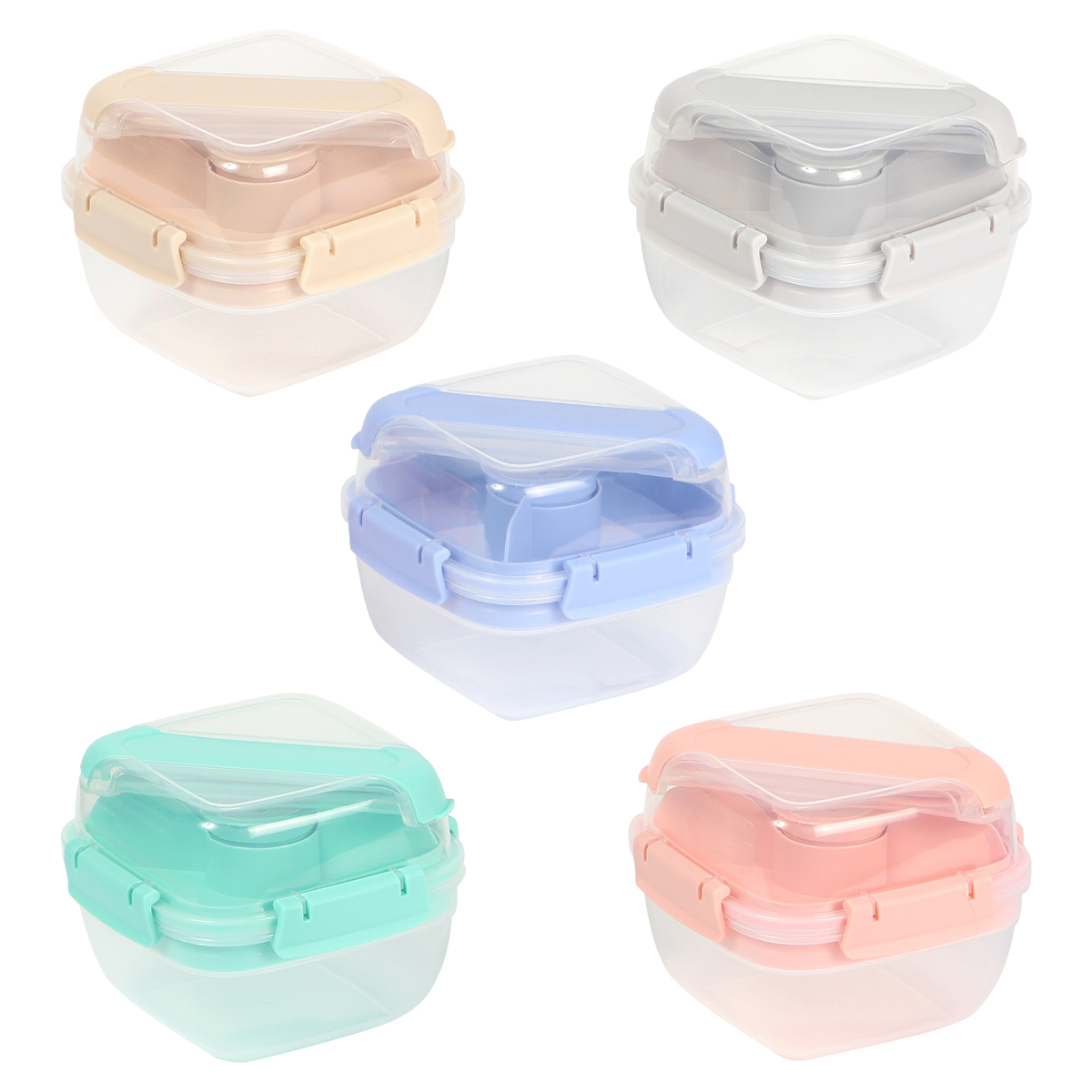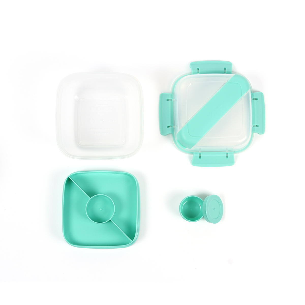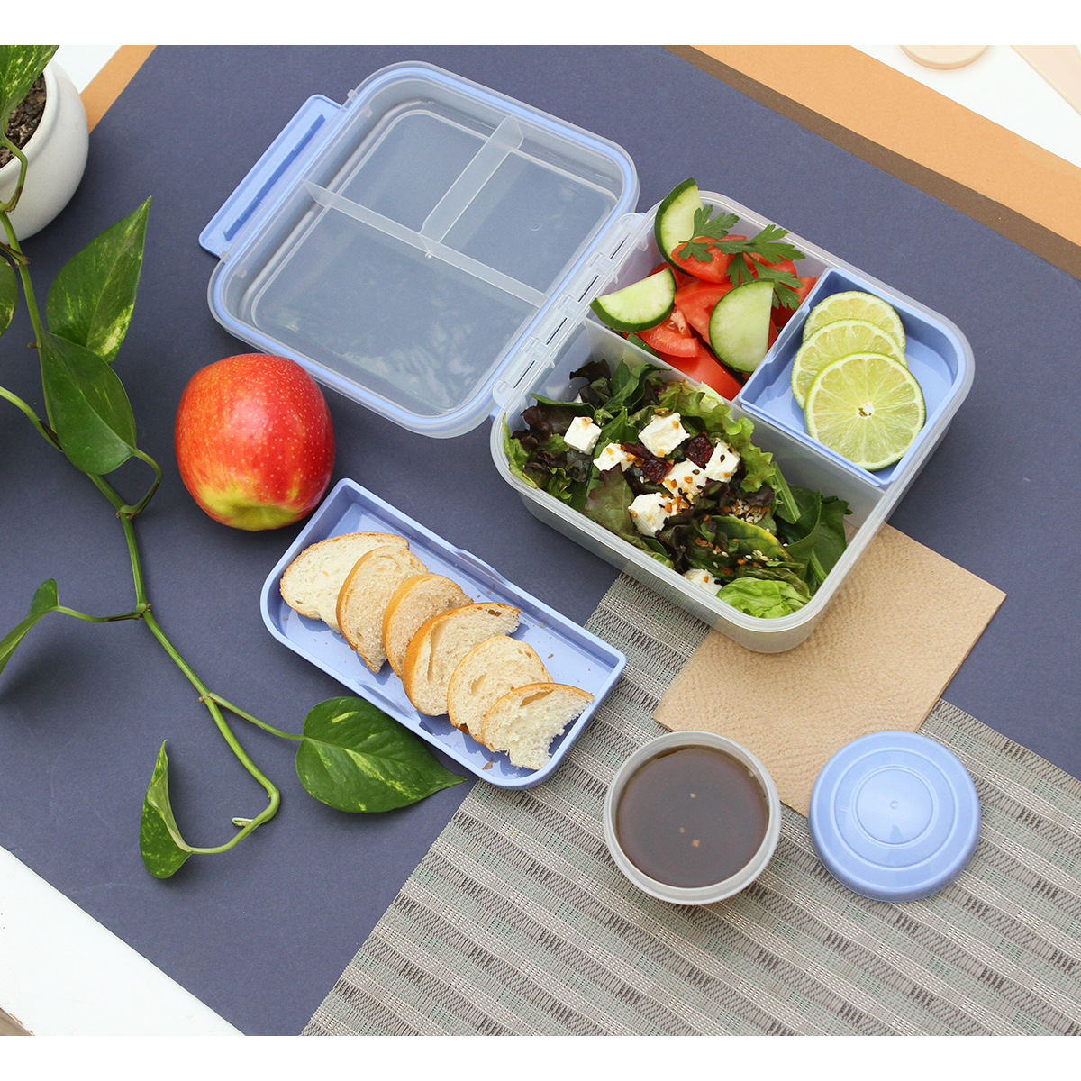 Contenedor de alimentos hermético fabricado en polipropileno y silicón. Es resistente e ideal para mantener tus comidas frescas y seguras. Con diseño compacto y práctico, es perfecto para llevar al trabajo o escuela. Incluye una cuchara, un tenedor, un cuchillo, un contenedor de alimentos con tapa con divisores y un contenedor pequeño tipo salsero.