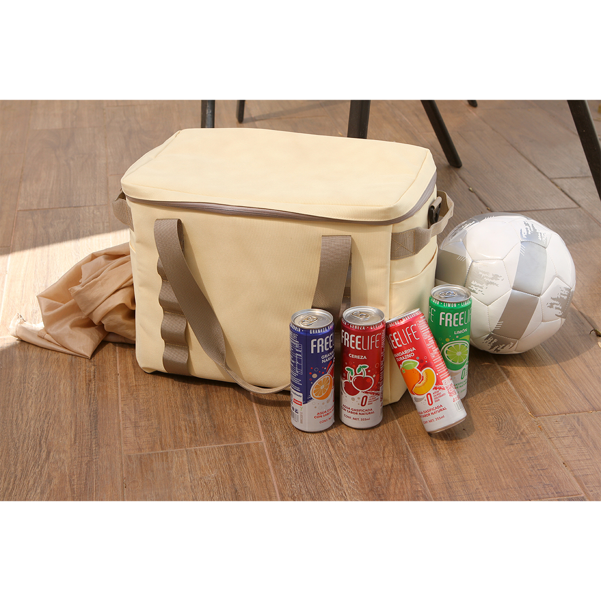 Hielera portatil fabricada en -- tejido tipo Oxford 600D con forro en polietileno, con gran capacidad de almacenamiento, ideal para conservar bebidas y alimentos fríos hasta por 8 horas.