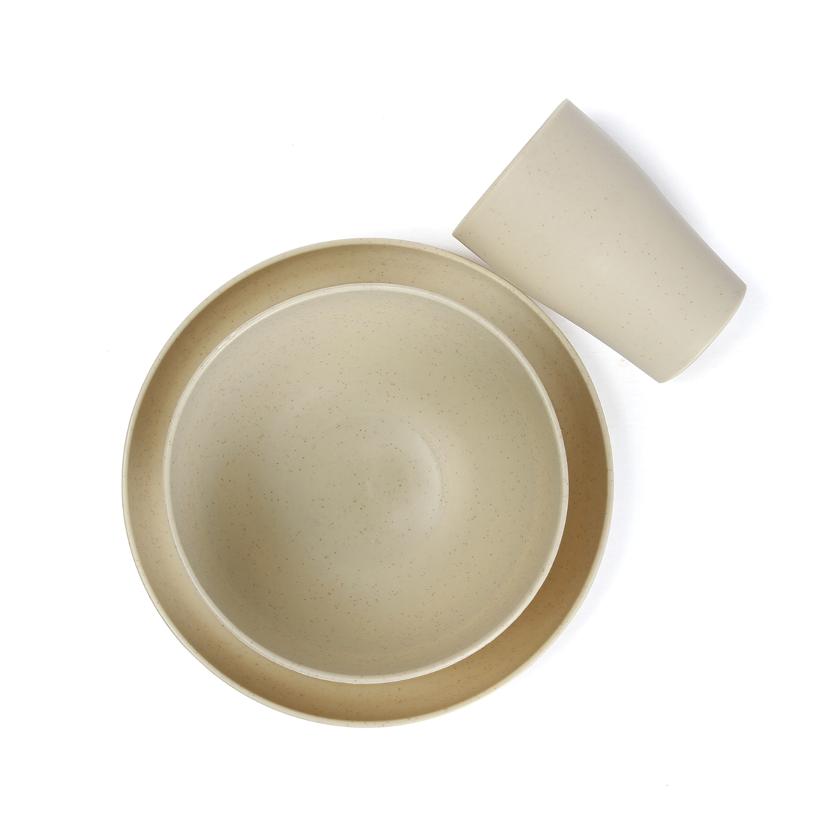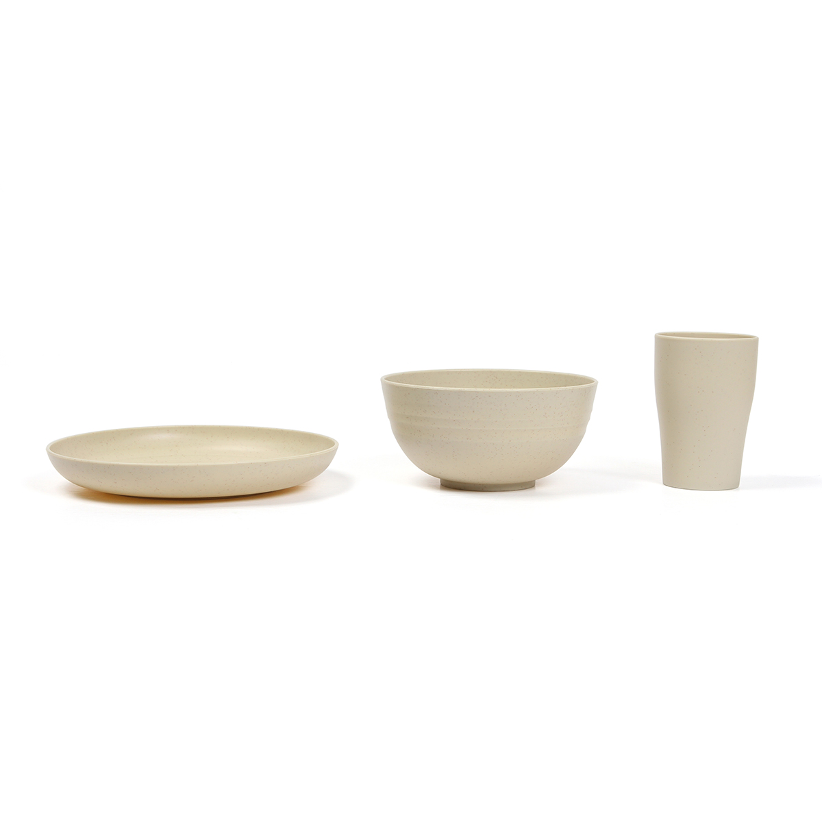Set de 12 piezas de vajilla elegante, ecológico y funcional. Este set incluye 4 platos, 4 bowls y 4 vasos fabricados con una mezcla sostenible de paja de trigo y polipropileno. Ligero, reutilizable, libre de BPA. Perfecto para el uso diario con un diseño minimalista en tono beige natural.