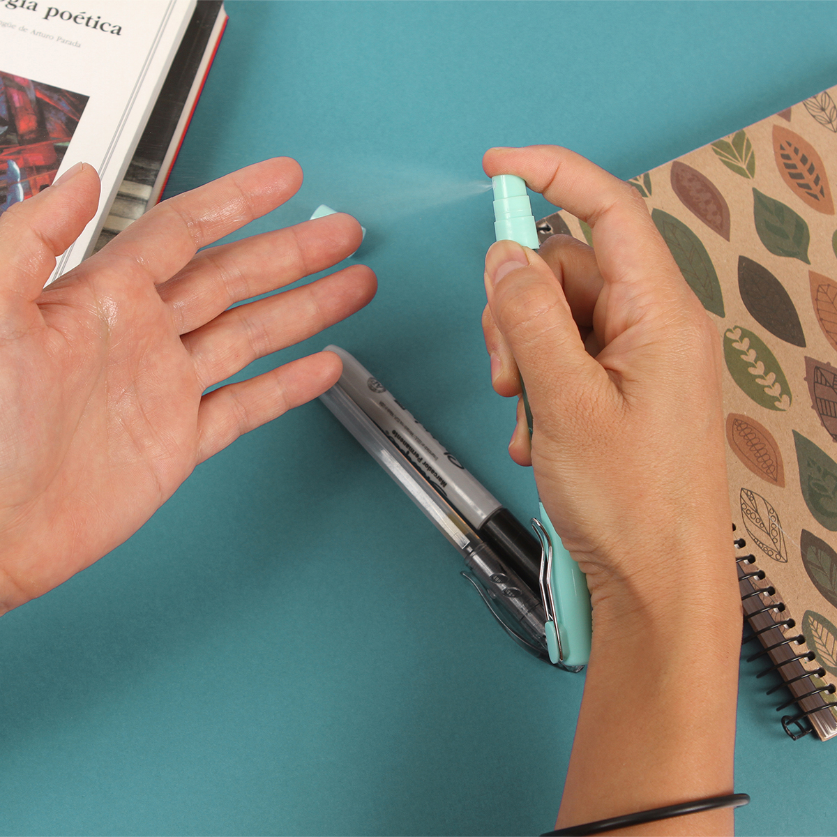 Bolígrafo Antibacterial fabricada en plástico ABS con atomizador y contenedor de 4 ml., para liquido desinfectante, con clip de metal y tinta de gel color negro. No incluye liquido.