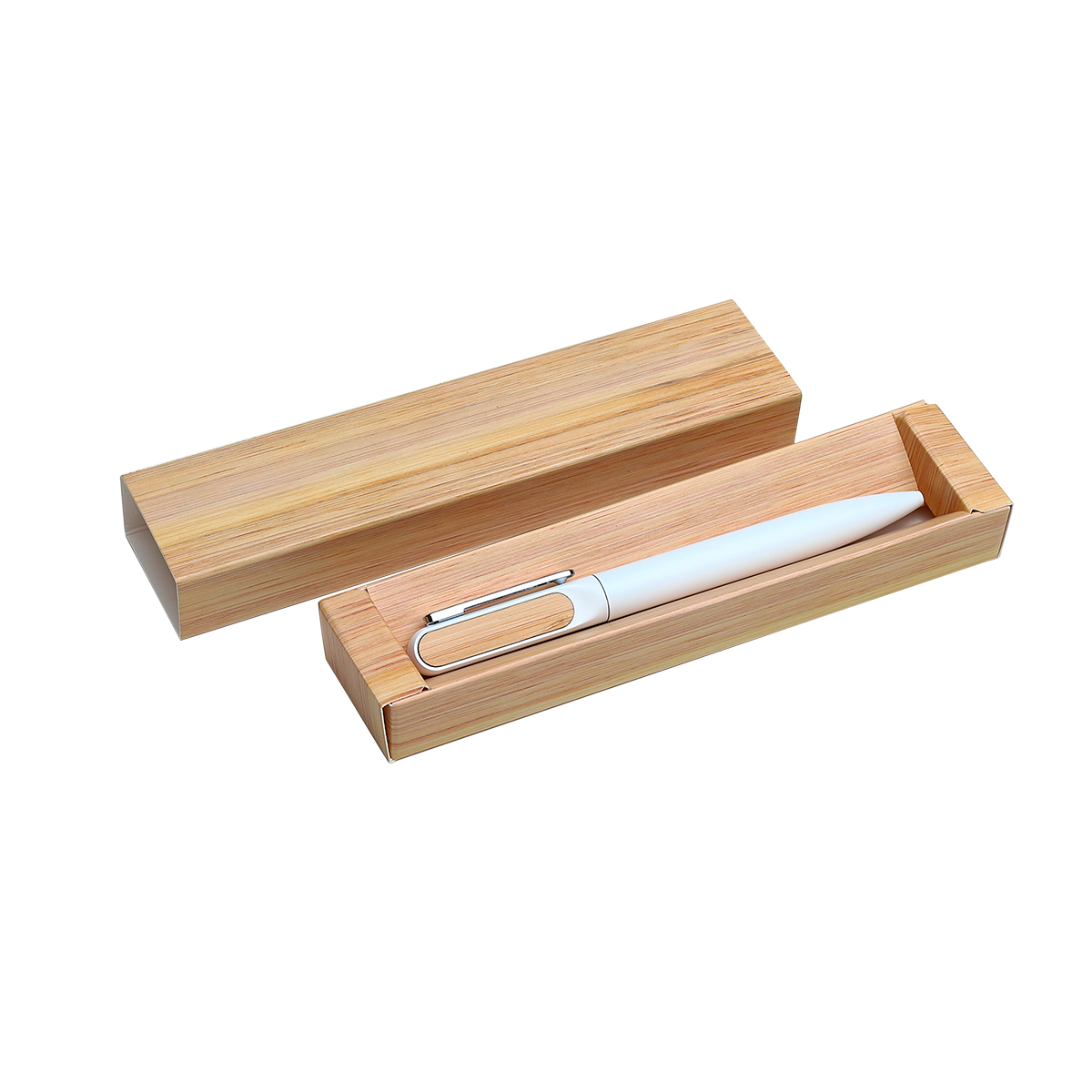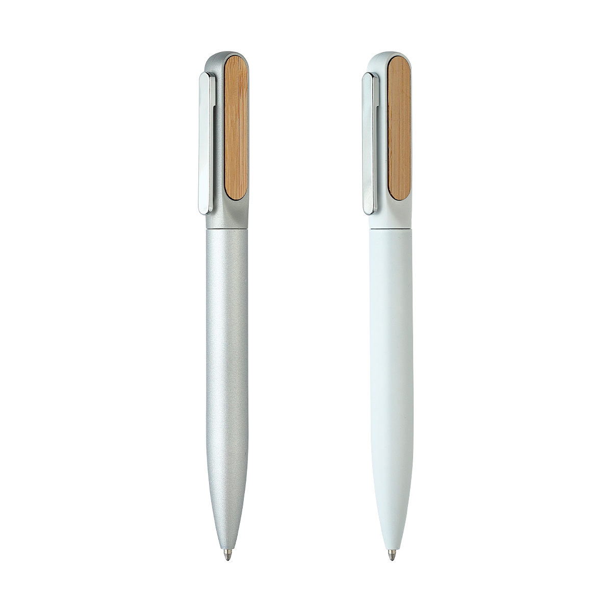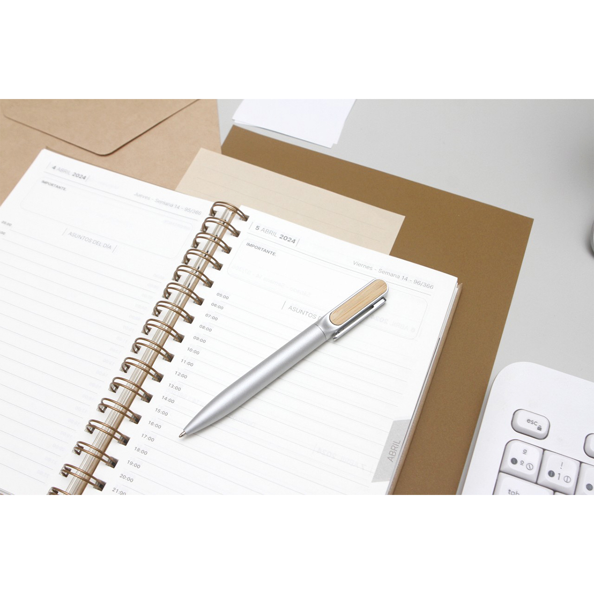 Bolígrafo con barril de aluminio acabado mate y detalle superior en bambú. Tinta de escritura negra. Incluye caja de cartón individual con apariencia bambú.