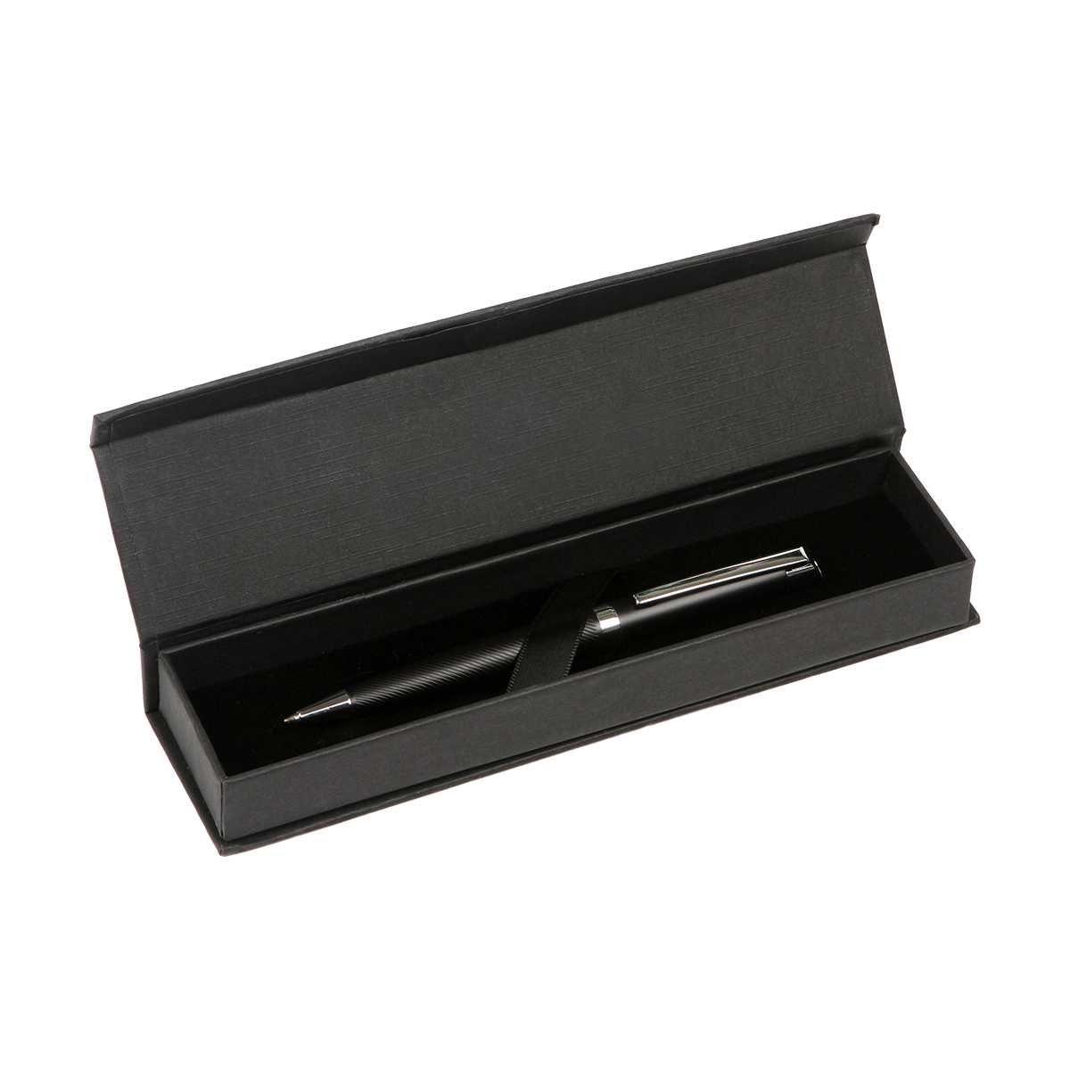 Bolígrafo metálico con detalles cromados en punta y clip, tinta de escritura negra. Incluye estuche individual.